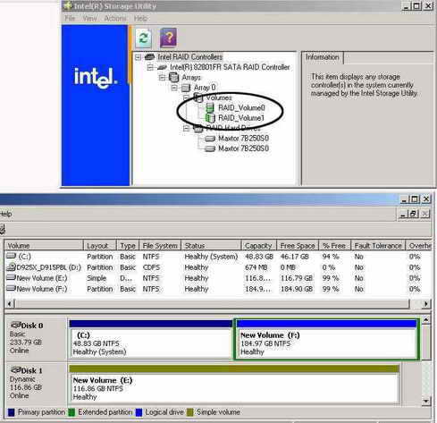 而完成这个操作很简单,只需要在IAA 4.0中直接在前面做好Raid0的Array0中添加卷,添加完成后,使用WinXP的磁盘管理工具将新加的卷转换为动态磁盘,就可以当做普通的磁盘使用了。经过我们测试,Raid1的磁盘性能只是比单个硬盘低了一点点而已。Matrix Raid的确是一项很实用的技术,也许会由此开辟新的磁盘应用领域。