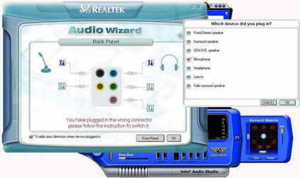 除了自动识别设备和配置插口的功能,High Definition Audio系统还可以轻松设置2.0到7.1音频系统的环境音效,我们进行了试听,High Definition Audio对于声音的定位做得很好,可以轻松地听出来自不同方向的声源,音质也相当清澈。