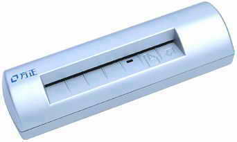 看,琪琪拿出了她的好助手──方正Z120名片扫描仪。应该说市场上的名片扫描仪为数不少,不过大多数都是方方的、扁扁的,对于这种雷同型的产品琪琪可不喜欢。琪琪使用的这款方正Z120名片扫描仪造型是椭圆柱体的(长轴为52mm,短轴为38mm,高为185mm),重量仅为0.25kg,拿在手里如果不注意,许多人还把它当成是手电筒呢!想想也是,圆圆的,而且还是银色外壳,不过真的很可爱哟!