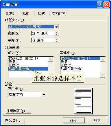 故障解决:笔者再次进入到页面设置选项,看看能不能找到什么。突然,在“纸张”选项卡中的“纸张来源”吸引了笔者的注意,因为其首页被设置成为“后端手动进纸”(如图),这会不会就是问题的原因所在?于是,笔者试着将该选项改为“默认纸盒(纸盘1)”,再进行打印,打印机就可以正常打印了。