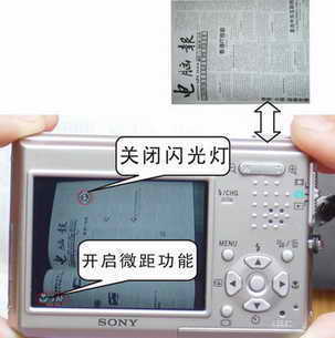 3. 可以将数码相机的拍摄像素调低,以便在有限的存储卡中放入更多的照片,同时将焦距模式调为“微距”模式(SAF“小花”图标)以保证图像清晰(图1)。并将闪光灯强制关闭,防止光线过强造成白纸反光,影响拍摄效果,最后别忘记将数码相机的时间显示去除,以免影响以后的文字识别;