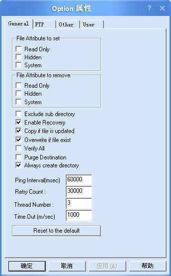 在“General”选项卡中,可以设置线程数,默认值是3,值设置大些可以提高拷贝的速度,但是不能设置得太大,以防止程序占用系统资源过大而导致死机。另外,根据需要再设置是否排除子目录(Exclude sub directory)、如果文件存在了是否覆盖(Overwrite if file exist)等,最后单击“应用”即可。