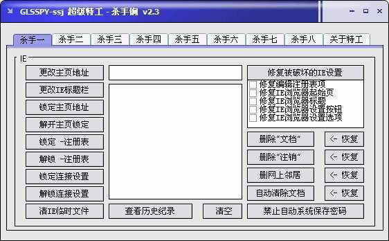 当然这个“超级特工杀手锏(GLSSPY-ssj)”的“本领”可不仅仅只是上面所介绍的,它还可以自动清除文档内容、删除注销网上邻居等安全设置,能随时保护你的电脑的安全。