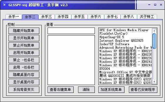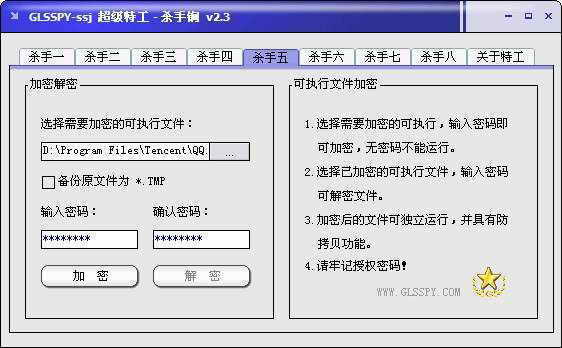 记得曾经在学生时代看过一本古龙名著《七杀手》,没想到在软件领域中也存在着一款拥有“八杀手”的系统安全软件《超级特工杀手锏(GLSSPY-ssj)》。它有八大系列62项功能,涉及到日常电脑操作的方方面面。下面就让笔者请出这几位“杀手”看看它们到底有什么厉害的杀手锏。