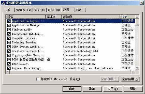 一些系统服务对于我们来说并不是必需的,比如distributed link tracking client( 若不使用ntfs分区并且没有连入局域网)、indexing service (你的计算机不提供远程文件索引和快速访问或者没有连上局域网)、net logon (你不想让局域网上的其他用户登录)、netmeeting remote desktop sharing (你不想使用netmeeting远程管理计算机)、tcp/ip netbios helper service( 你的计算机不准备让别人共享),可以在Msconfig中“服务”列表中将它们去除。