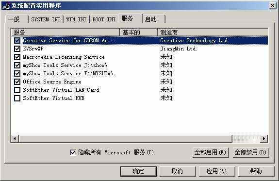 比如希望在此处禁止某项服务时,只须将相应服务项前复选框中的勾选去除即可。如果担心去除操作系统中某些服务有可能会影响系统性能,那么还可以选择仅去除安装软件时所加载的一些服务,只要勾选“隐藏所有Microsoft服务”,我们就可以在对话框中看到软件加载的服务了(图4),是不是清爽许多了呢?这下你就可以根据需要去停止那些不需要的服务了。