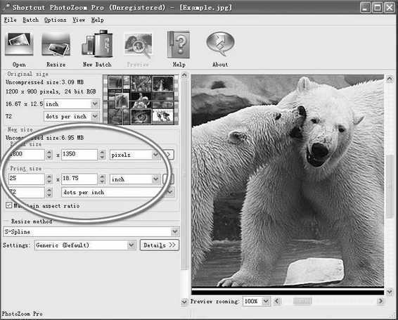 经过试用PHOTO ACUTE软件,发现这样的软件在电脑上很早就有过,如PhotoZoom就是一款比较优秀的软件(下载地址http://www.fangdown.com/soft/3078.htm),其使用方法非常简单。首先你打开要处理的图片,然后在左边设置面板中设置你需要的大小,设置完毕后经过软件运算,清晰的大图片便产生了(图1)。