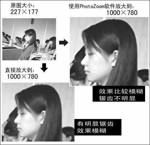 用过Photoshop的人看了这样的对比就会明白,实际上PhotoZoom软件是借用了模糊和锐化处理的过程,然后经过色彩上的调节,使放大后的照片避免锯齿的出现。对原来的照片实际上是在“牺牲”清晰度的基础上进行放大。这里的30万像素变为120万像素,只能说将原来的30万像素放大到120万像素这个范围内有较理想的效果,超过这个范围图像效果就较差,它与直接拍摄出来的120万像素的质量是不能比的,所以说这样的放大是在有限的范围内进行的。