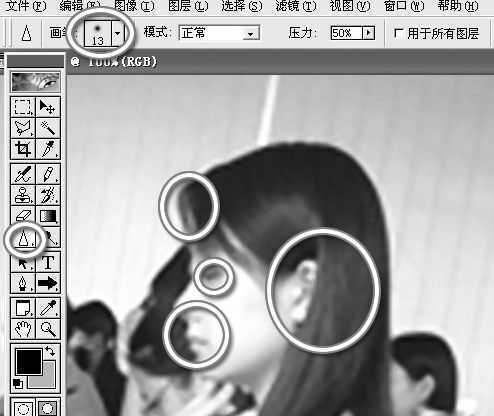 3.选择工具箱中的锐化工具,然后在锐化工具的属性控制面板选择一个适合大小的柔边笔头,在照片中重要部位,如眼睛、嘴巴和头发部位小心涂抹(图3)。这里涂抹的作用就是利用锐化过程来使重要的部位更清晰。
