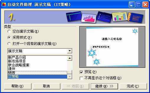 Step1:启动WPS飓风“演示制作”,系统自动启动“自动文件助理”(图1),在这里你可以选择是打开一个空白文档,还是选择WPS飓风自带样式,或者直接打开已有文档。对于初级用户来说,直接选中“采用样式”类型更为适合,然后在下面选择一种合适的“样式”(如“IT策略”)。