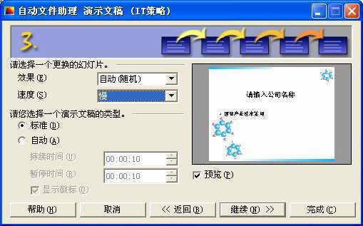 Step2:两次单击“继续”按钮(在第2步仍然需要做一些设置),进入“自动文件助理”之3(图2),在这里,用户可以设置“更换幻灯片”的“效果”和“速度”,以及“演示文稿类型”(标准或自动)。应该说在这点上同微软PPT相比,WPS飓风的人性化操作做得不错。