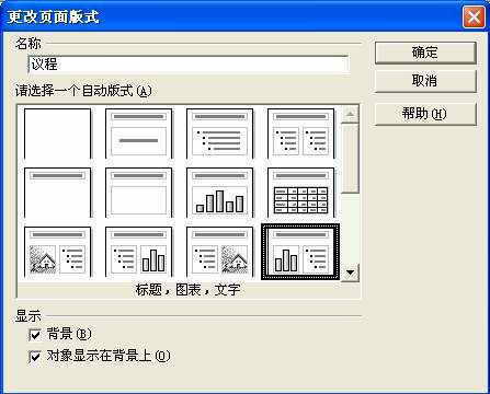 小贴士:如果你觉得相应的页面版式不适合文稿,只要点击一下“演示文稿”图标工具栏上的“更改页面版式”按钮,打开“更改页面版式”对话框(图4),选择一种合适的版式,确定即可。