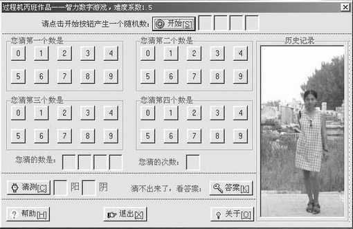 最近玩“轩辕剑三外传”,里面涉及一个小游戏。游戏规则是:从0-9中随机产生四个不重复的数字,如果你猜中一个数字并且数字的位置正确,则表示1阳,如果你猜中一个数字但数字的位置不正确,则表示1阴,最多猜10次,猜出4阳即可获胜。文曲星上好像也有这个游戏,我想干脆自己来制作这个游戏,工作之余开发开发智力。