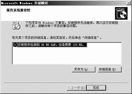 接着“Windows 升级顾问”将会自动对当前硬件进行兼容性检测,并告诉用户问题所在。例如图2中可以看出安装程序检测到当前硬件只有96MB内存,如果想解决这个兼容性问题则需要128MB内存。
