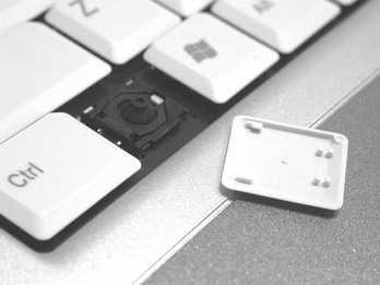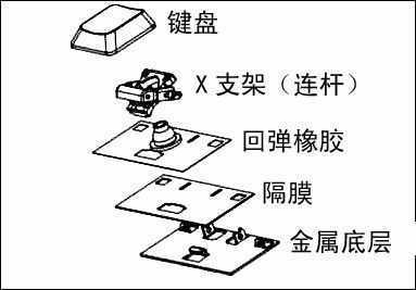 在笔记本电脑的组件中,键盘并不是最重要的部分,但由于它的特殊性(用户每天要敲击),使它在笔记本设计体系中处于一个很重要的地位。键盘的设计原理很简单,将键盘键帽、回弹橡胶、连杆和底部支撑钢片组合在一起就得到一个完整的键盘系统(图1)。