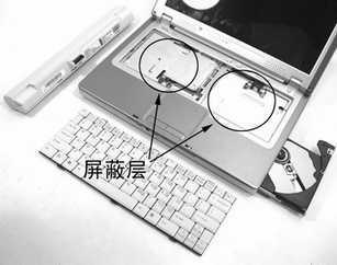为了进一步增加键盘的手感,X200大面积的增加了屏蔽层(图4),几乎铺满了整个键盘底部,屏蔽层的作用一是更好地增强屏蔽效果,减少电气干扰,二是成为了键盘底部支撑的“第二层钢板”,事实证明这种设计很合理,它成功地将机身厚度降低了0.2mm,并且使得键盘得到了很好的支撑。