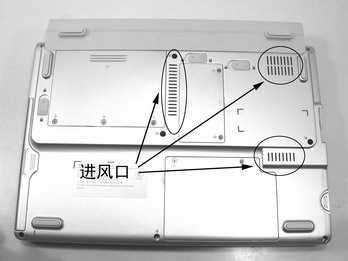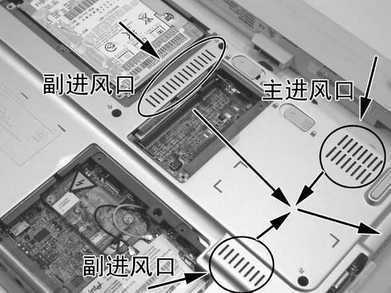 当风扇转动时,空气流入主进风口(图9中右中部的两排进风口),在设计的时候有意减少主进风口的数量,由于主进风口的进风量不足以满足风扇转动所需要的气流,此时机身内部会形成负压,这样副进风口就会辅助进风,硬盘和内存所产生的热量就会被副进风口进入的气流带走,同时由于硬盘本身产生很大的热量,副进风口所进入的气流还不足以将所有的热量带走,所以硬盘盖板采用了金属材质,那么多余的热量就会由金属盖板传导出去。笔记本的噪音也是来自于风扇和硬盘两个部分,前面说过,散热风扇采用了径向送风设计,它的特点是效率高,转速低,低转速也就意味着较低的噪音;硬盘噪音的基本解决方式就是使硬盘盖板的密闭性更好,使噪音透不出机壳。从小型笔记本自身来讲,性能并不是用户所追求的目标,因此选择硬盘的时候可以选择一些本身噪音就低的产品,例如这款笔记本使用的就是以安静而著称的富士通硬盘。