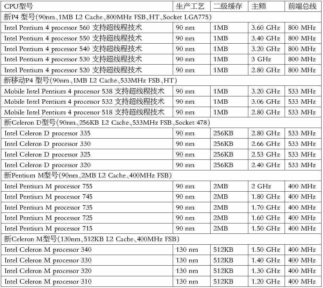在这里我们可以看出,桌面版的P4处理器(包括基于桌面版P4处理器的移动版P4处理器)的编号都是5XX,数值越大,性能越强。Pentium M处理器的编号都是7XX,数值越大,性能越强。而Celeron处理器(包括基于Pentium M处理器的Celeron M处理器)的编号都是3XX,数值越大,性能越强。