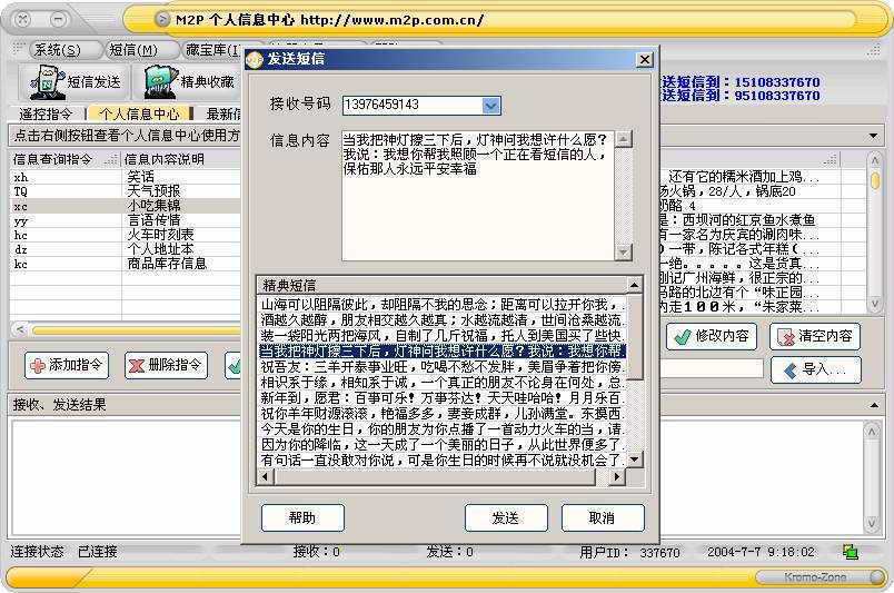M2P使用非常方便,本身已经内置了很多类型的短信,发送短信时你只需要从主界面中选择“短信”菜单下的“短信发送”命令,即可弹出“发送短信”对话框(图1),在其中填入接收短信的手机号码,并选择或输入信息内容,按“发送”键即可将短信送出去。除了发送短信外,M2P还可以接收短信。另外,我们还可以通过短信来控制电脑,不过这是收费的注册用户才有的功能。