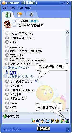 在现有的好友当中,你只能对已激活了手机的好友(有手机标志)发送短信,另外你也可以添加电话好友,向电话好友发送手机短信。要发送手机短信时,可以选定要发送的用户,按鼠标右键,然后从快捷菜单中选择“发送手机短消息”,即可像普通聊天一样发送短信了。