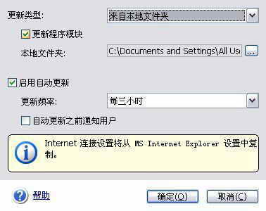 此过程中会遇到提示“是否将XXX文件替换XXX文件”,全部选“是”。直到每日更新(daily.zip)解压缩完后,再打开AVP的设置标签,选择配置更新器,在更新类型中选择“来自本地文件夹”,然后将本地文件夹指向Kaspersky Anti-Virus Personal Updates目录(见图)。