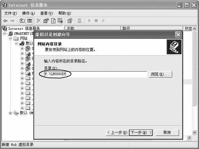 Step1 运行“Internet信息服务”,在打开的窗口中,依次展开“本地计算机→网站→默认网站”。右键单击“默认网站”,依次点击“新建→虚拟目录”,之后会打开“虚拟目录创建向导”,单击“下一步”,在“别名”中输入获得此虚拟目录访问权限的别名,比如LB;单击“下一步”继续;在“目录”中输入论坛存放的路径,比如“F:\LB5000XP”(图1),单击“下一步”;然后设置一下“访问权限”即可。