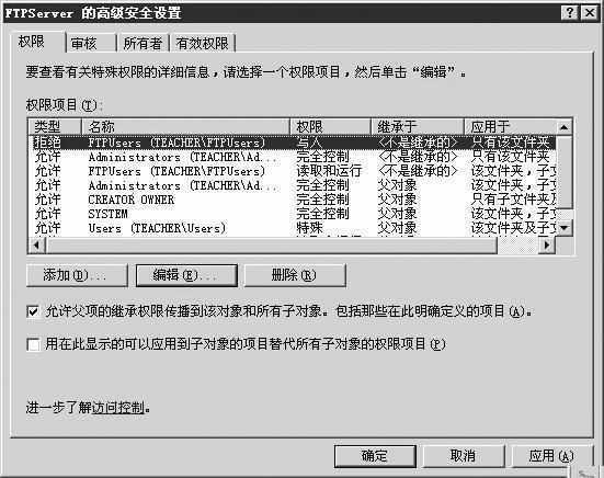 为了使“拒绝写入”权限仅对“FTPServer”文件夹有效,还需要单击“高级”按钮,在“FTPServer的高级安全设置”对话框中双击“权限列表”中的“拒绝FTPUsers写入”选项,打开“FTPServer的权限设置”对话框。在“应用到”下拉列表中选中“只有该文件夹”选项,然后连续点击“确定”按钮完成设置(见图)。