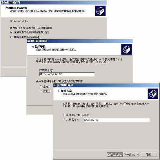 虽然Windows Server 2003中有完善的打印机管理功能,但因为一台物理打印机无法对两个组进行使用时间的分时使用管理,所以首先要为物理打印机安装两台逻辑打印机才行。实现这个过程很简单,只要重复为物理打印机安装两次相同的驱动程序就可以了(图1)。在安装的过程中要注意必须为两台逻辑打印机设置不同的名称(包括共享名称)。