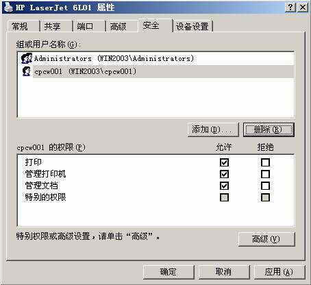 接着,小胖就开始对两台逻辑打印机进行设置了。首先进入A逻辑打印机的属性窗口的“安全”选项卡设置界面,将除了“Administrators”用户组外的所有用户和组均删除掉,然后添加CPCW001用户,并赋予了该用户有管理打印机的权限(图3)。