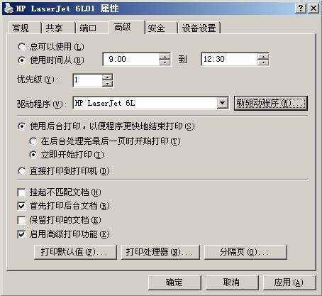 因为单位是早上9点开始工作,所以小胖在“高级”选项卡设置界面中,设置A逻辑打印机的工作时间为从早上9:00到中午12:30(图4)。