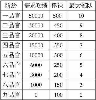 阶级:势力内武将地位表示,由高至低是从一品官至九品官,功绩越大则阶级越高,阶级影响武将的俸禄额,出阵带领战斗的最大部队数,以及军势长出阵的总部队数,太守只能由五品及五品阶级以上官员担任,都督只能由二品及二品以上阶级官员担任?