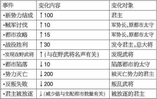 名声:现在的名声,世间对武将的评价,名声高,武将在与其他武将交流时“亲密”上升得越快,“仕官”成功率越高?“一骑讨”“舌战”胜利会令名声上升,以下将导致名声变化: