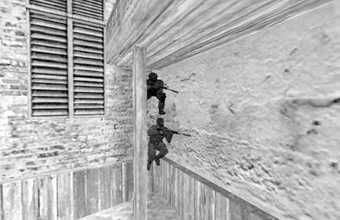 2.Inferno的A区左侧的二楼阳台那个位置也有这么一个穿墙点。根据图4、5中所示的位置,只要用人梯配合就可以将队友从阳台下面穿上去,原本需要三到四个人的高度两人人梯就能完成。如果有T从这里进攻的话,还能出其不意地来一次偷袭。