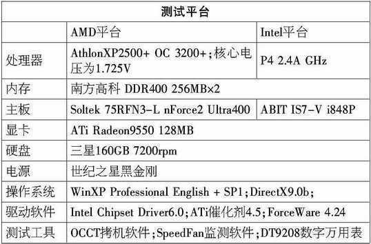 本次测试我们采用了两款“火炉”级的CPU,同时它们也是一般用户使用比较广泛的处理器。一款是AthlonXP2500+超频到3200+。同时将核心电压从1.65V提高到1.725V,发热量惊人;一款是Prescott核心的P4 2.4A GHz,虽然它的主频只有2.4GHz,但是它的发热量甚至超过了Northwood核心的P4 3GHz处理器。所以这两款当仁不让地成为我们测试的首选。