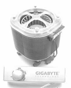 GIGABYTE将GH-PCU21-VG命名为3D Cooler,是因为它的散热片采用360°出风设计,而涡轮风扇的上下都可以进风。GH-PCU21-VG的加工工艺相当精细,铜底作了镜面处理,而且铝质鳍片也制作得很精致。GH-PCU21-VG的风扇采用6cm的涡轮设计,工作电流为0.5A,配备了调速计,可以从2000rpm到4000rpm无级调速,配合前置面板就可在关着机箱的同时进行转速调节。