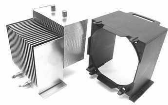 材质、制造工艺、底部的厚度、风道设计、热量的交换方式等等都会影响散热片的散热效率。首先是选材料,一般都采用铝或者铜这两种热阻低的金属(或者合金);制造工艺方面,有简单的挤压、插齿、回流焊、嵌铜、塞铜、冷锻等等,其中插齿、嵌铜、塞铜、冷锻是铜铝结合的技术,充分利用铜吸热快、铝散热快的优点,提高散热器的效率。
