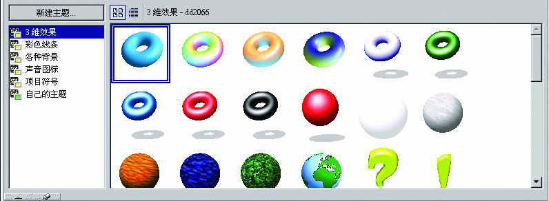 要在Impress中添加剪贴图十分容易,不仅可以添加平面的剪贴图,而且还可以添加立体的剪贴图。选择主工具栏中的画廊按钮便可添加各种美观专业的剪贴图了(图3)。
