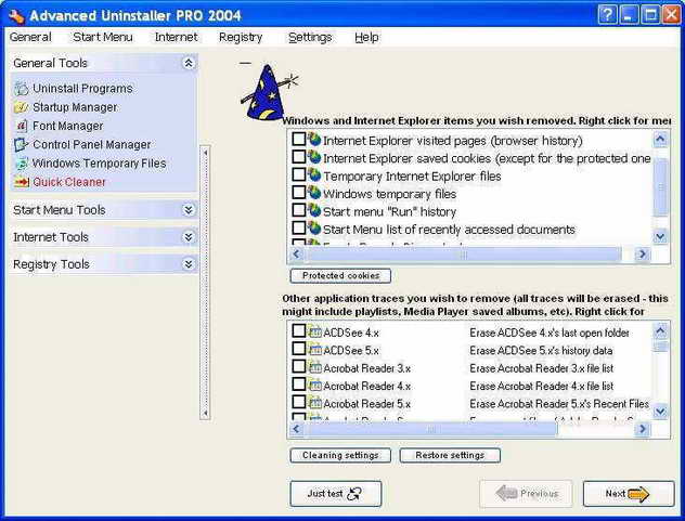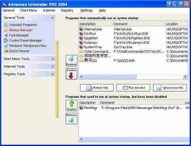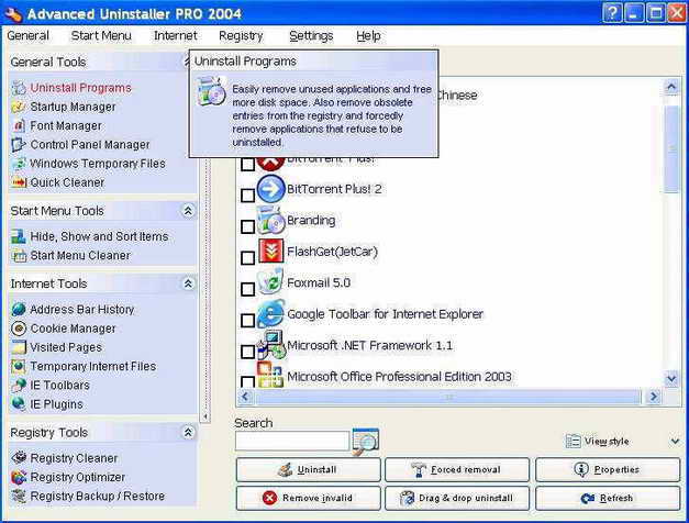 Advanced Uninstaller PRO 2004是一款强力卸载工具,除有一般的软件卸载功能外,还提供了自由显示或隐藏开始菜单项目、注册表减肥、Cookies管理、启动管理、字体卸载等功能。这一最新版本可以让你删除开始菜单中的整个目录,通过简单的点击即可清除注册表中有关这个软件的所有信息,这样我们就再也不用到注册表中去手工清理了。