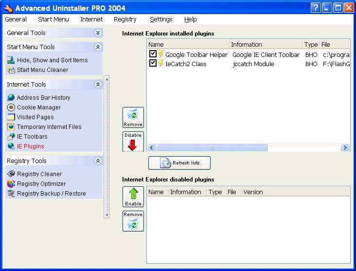 Advanced Uninstaller PRO 2004提供了“IE Toolbars”和“IE Plugins”两个工具,前者可以清除IE中的第三方工具条,后者则可以清除IE工具栏中随印程序而安装的按钮图标(图6),这下朋友们就再也不用去打开注册表进行操作了。