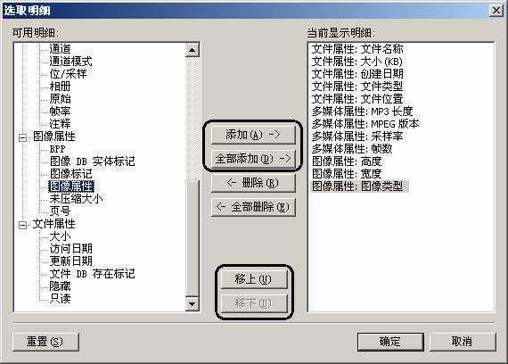 2.我们可以针对“备忘录”所要记录的文件的类型来选择需要的字段:比如这里要记录的是图像文件的信息,就可以在“图像属性”的分支中选中“高度”、“宽度”和“图像类型”等字段,并添加到右边的“当前显示明细”一栏中。