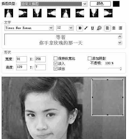 从“任务列表”里的“编辑”中选择“插图”,弹出“插图提示”,点击“添加插图”,在弹出的“插图属性”对话框中,选择合适的插图类型(这里提供了12种常用类型)。我们选择“自定义插图”,选择一张手捧玫瑰的婚纱照,添加后回到属性设置框(图4),选择一种方向,在预览窗口中拖动绿色矩形调节插图的位置和大小。在文字区写上祝福的话语(通过设置格式、空格、换行调整文字在插图中的位置),最后在视频预览中显示(图5)。