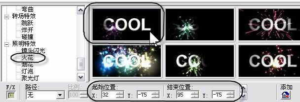 下面制作文字的三维动态效果。首先选择主界面下方对象样式项目下的“纹理”子项,选择一个你认为比较好看的效果,双击这个效果就将它印到编辑界面的“个人DV集”这几个字上了。不过这个效果不是动态的,下面我们为它添加一个动态效果。选择主界面下方照明特效项目下的“火花”子项,这里使用的是第一个特效,双击此特效后,这个特效就作用于整个画面中了。但我们的文字是在画面的右下角,故这里还需对此特效的参数进行一下必要的设置,修改起始位置的座标为X:32、Y:-75。而结束位置处的座标为X:95、Y:-75。当然我们也可以根据自己的需要进行调整,如图2所示。