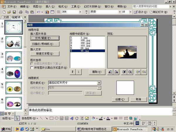 单击“图片版式”右侧的下拉列表,可指定每张幻灯片中图片的数量和是否显示图片标题。单击“相框形状”右侧的下拉列表,在这里为宣传册中的图片指定形状。需要注意的是,如果要使用该功能,必须在“图片版式”禁止“适应幻灯片尺寸”选项。