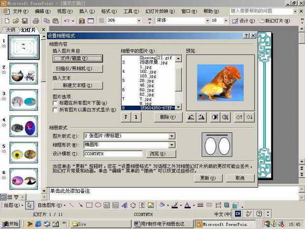 比如我们在这里选择图片版式为“2张图片(带标题)”,相框形状为“椭圆形”,再选择一种设计模板,单击“更新”结束(图2)。现在就可对效果进行进一步美化。