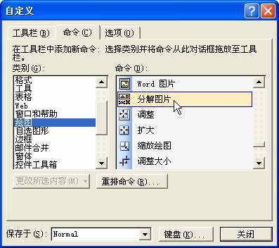 在默认情况下,“分解图片”功能是隐藏的。我们要使用该功能,首先运行Word XP或Word 2003,依次点击“工具→自定义”,单击“命令”选项卡。在“类别”中找到“绘图”,接着在右侧的“命令”中找到“分解图片”(图1)。然后按住鼠标左键把它拖放到工具栏任意位置即可。