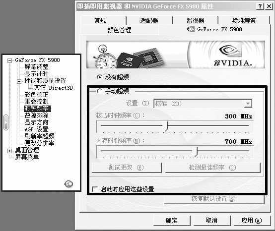 阐明了超频方向,具体的超频操作倒是十分简单,其原理都是利用第三方工具打开注册表中对超频选项的支持。NVIDIA可以使用NvCool FX或nVHardPage(有一大堆第三方软件支持开启超频选项)打开超频选项。在驱动的频率设置中有2D和3D两个下拉选项,不同的应用对应不同的频率,既可以充分发挥性能,又可以保护显卡。但并不是所有的GeForce FX系列显卡都有这个选项。显卡BIOS中的设定,决定了这项功能的有无。超频时不要太激进,慢慢把频率指针向上拉,找到一个频率后,运行3D游戏或测试程序进行验证,要保证画面没有破损、花屏、缺失,才能证明显卡的确可以稳定工作在这个频率之上。最后勾选“启动时应用这些设置”就可以实现开机自动超频。