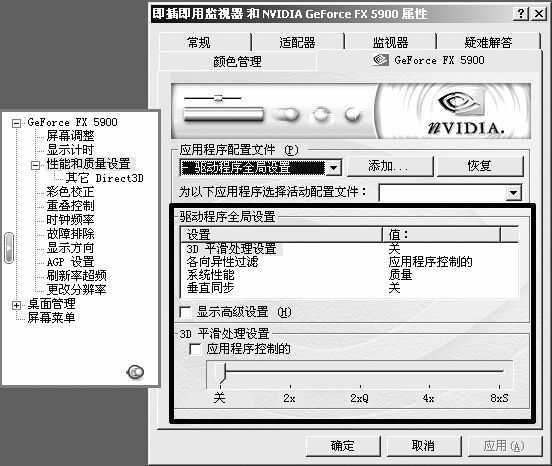 在这一部分,我们简单介绍一下NVIDIA和ATi在驱动中分别要注意的3D设置和简单优化,为以后针对具体游戏优化打下基础。