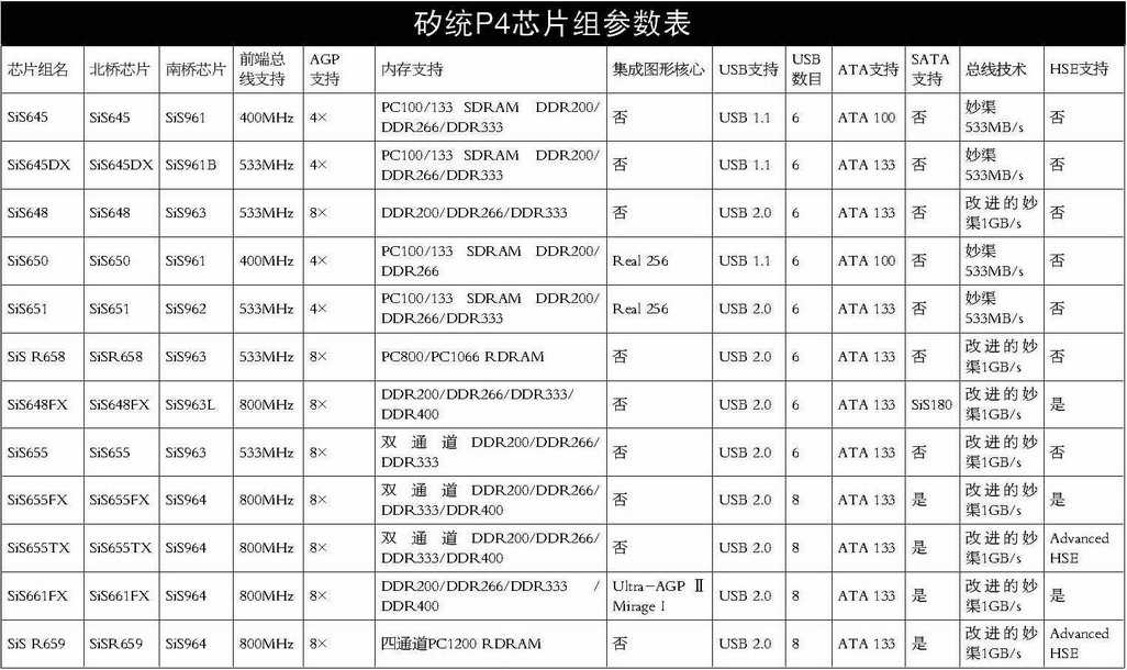 作为矽统新一代的整合芯片组,SiS661FX北桥芯片为SiS661FX,支持800MHz前端总线和AGP 8×,支持最大3GB的DDR200/DDR266/DDR333或2GB的DDR400,整合了支持Ultra-AGP Ⅱ技术的Mirage I图形核心。南桥芯片则为SiS964,支持ATA133和2个SATA设备,最大支持8个USB 2.0接口,支持RAID 0、RAID 1、RAID 0+1和JBOD功能。SiS661FX还采用了HSE技术。南北桥之间采用改进的妙渠(MuTIOL)连接,带宽达到了1GB/s。