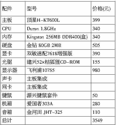Duron 1.8GHz虽然属于AMD的低端产品,但性能相当强劲,比较超值。顶星H-KT600L主板采用的是KT600芯片组,板载两个SATA接口,支持AGP 8×以及DDR400内存,还板载有网卡。80GB的硬盘对付日常印也绰绰有余了。而双敏速配7618增强版有一定的超频性,玩CS相当的流畅,对于玩其他的游戏也足够了,还提供S-Video输出接口,可以将画面输出到电视机上。由于没有采用集成显卡的主板而独立使用了一块MX440显卡也让它的3D显示性能与其他集成主板相比要强劲不少。整套电脑价格虽不高但性能还是不错的,适合想感受电脑而与不愿多花费的用户。