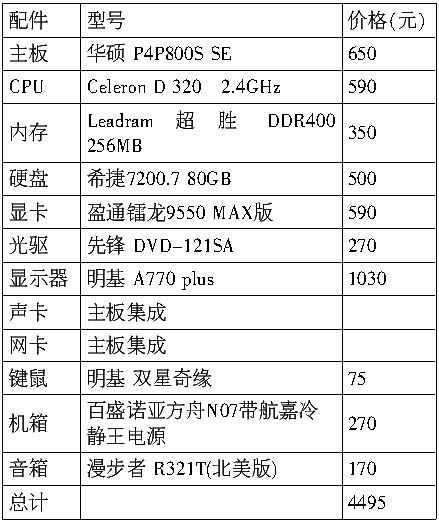 主频为2.4GHz的Celeron D 320由于有256KB的二级缓存,配合其533MHz的前端总线,性能相当不错,超频性能也非常好,超频之后性能更加强劲。作为办公、家庭用机,无论文字处理还是玩游戏都够用了,配合华硕 P4P800S SE主板可以安全稳定地工作。盈通镭龙9550 MAX版也能破解Radeon 9550的锁频限制,具备一定的超频潜力,性价比不错。采用锐彩二代技术的明基A770 plus显示器显示效果相当不错。整套配置在稳定的基础上提升了性能,适合家庭用户使用。